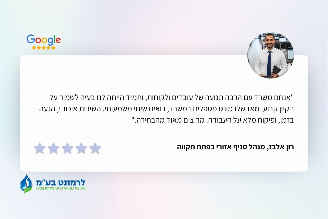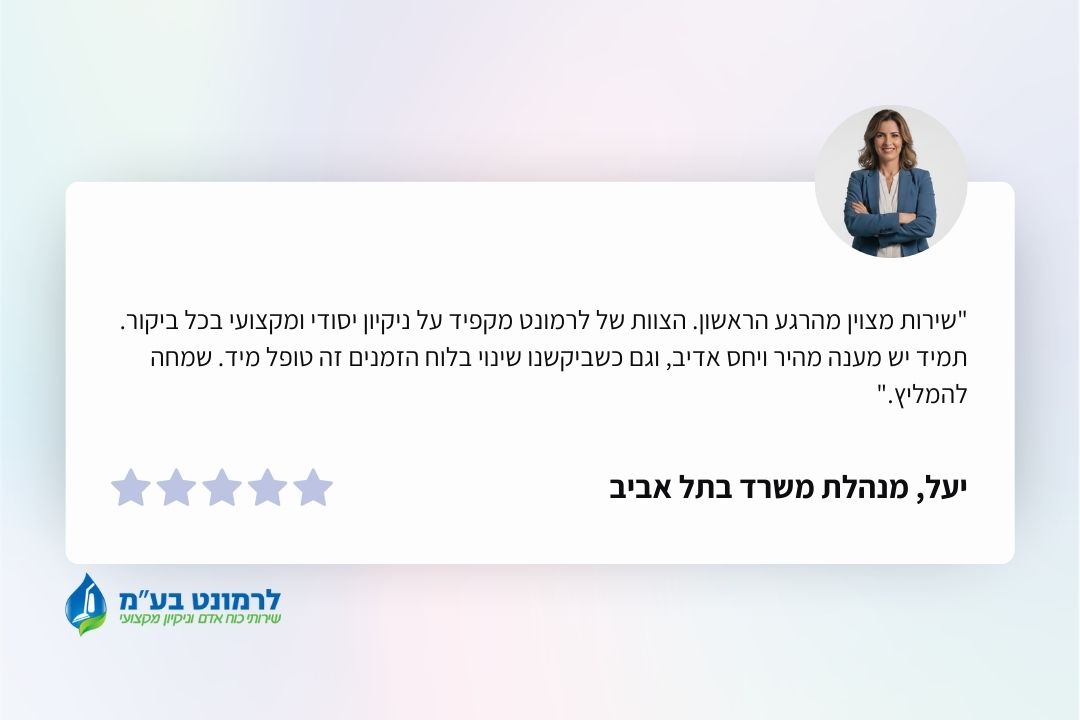 לרמונט מספקת גם שירותי ניקיון מתקדמים המיועדים למשרדים ומבנים הדורשים טיפול מקצועי. אנו מבצעים ניקיון יסודי של אזורים גבוהים, הברקת משטחים, פוליש מותאם לסוג הרצפה, ניקוי שטיחים וריפודים וחידוש אזורים שנשחקו לאורך זמן. הצוות המיומן שלנו משתמש בציוד ייעודי ובחומרי ניקוי איכותיים, ומקפיד על תהליך עבודה בטוח ומבוקרת המבטיח תוצאות ברמה גבוהה לאורך זמן.