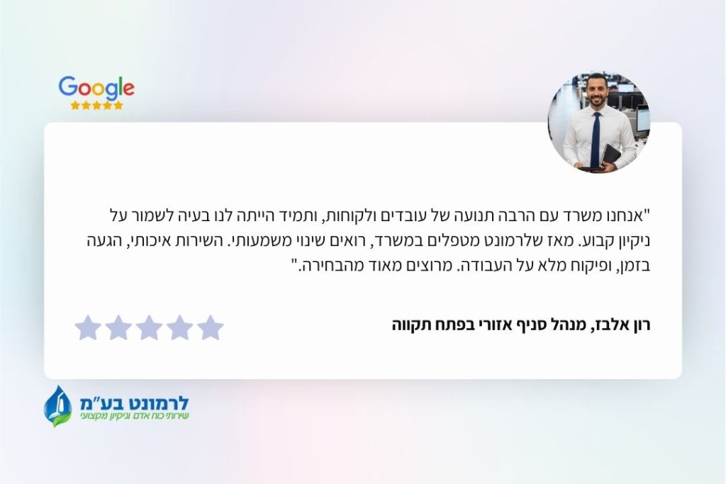 "מאז שלרמונט מטפלים במשרד, רואים שינוי משמעותי. השירות איכותי, הגעה בזמן ופיקוח מלא על העבודה."